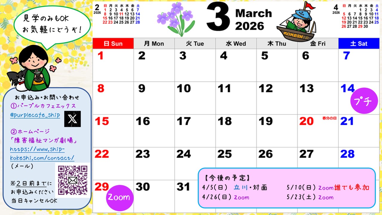 パープルカフェの開催予定(Zoom・立川・プチイベント)